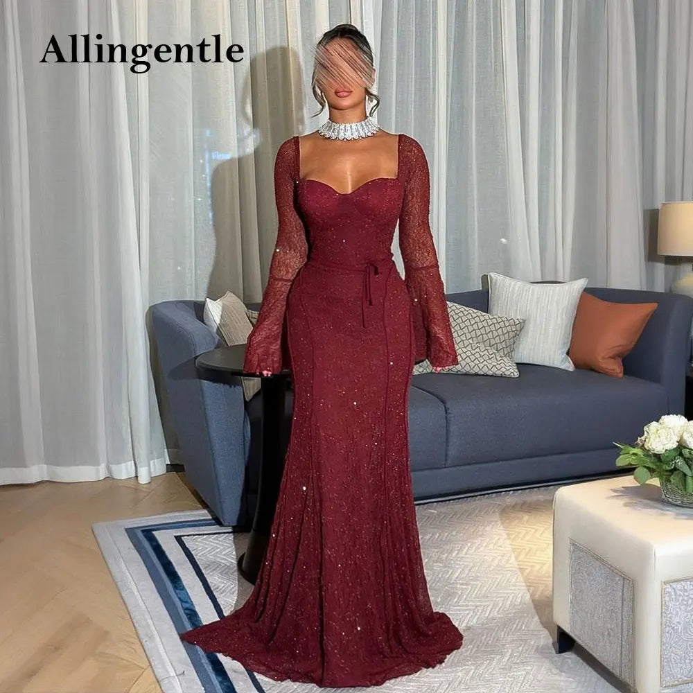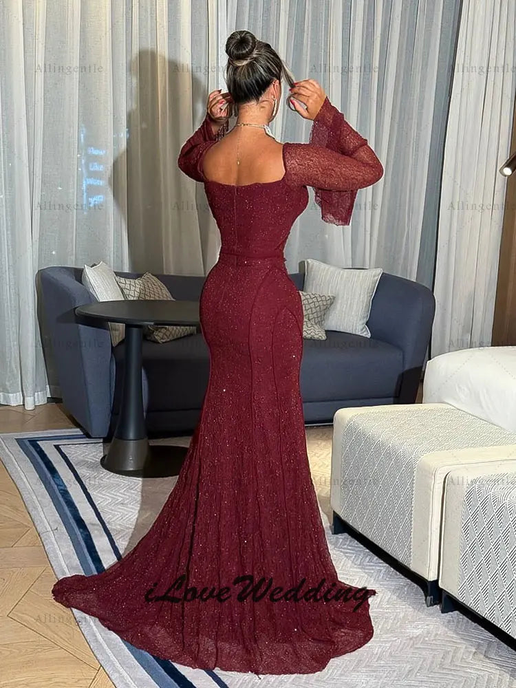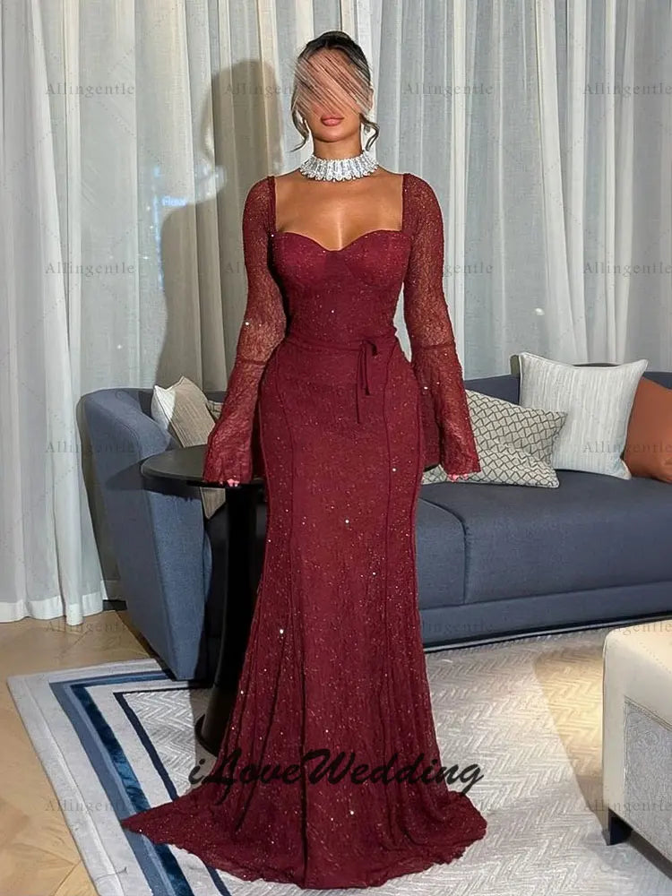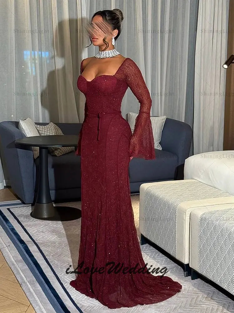 Glitter Burgundy Evening Birthday Gown Gala Lace Mermaid Prom Formal Dresses Long Sleve Sweetheart Saudi Arabic Customized