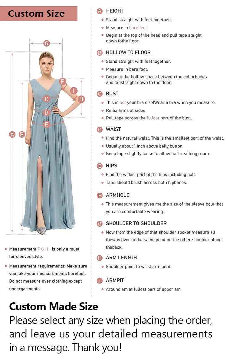 (4) We can customize the dress that fits you for free according to your measurement information, but we don't accept any return for customizing the size and color, including changing the style return. Please understand.