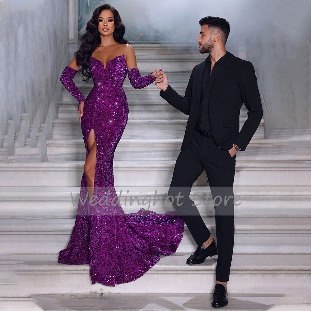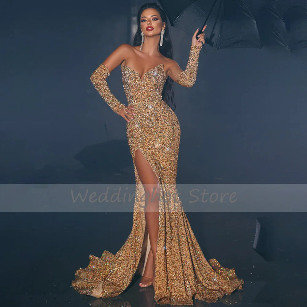Glitter Evening Dresses For Women 2023 Gold Sequined Mermaid Sexy Gowns Long Side High Slit V Neck Trumpet Prom Dress