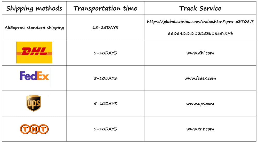 4. About shipping time: DHL/Fedex/UPS generally takes 3-10 days, Aliexpress standard express delivery generally takes 2-4 weeks, and the shipping time will vary in different countries.