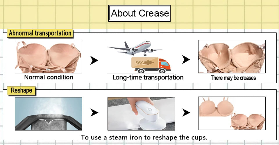 After long-time transportation, there may be crease on cup. It is recommended to use a steam iron to reshape the bust cups.