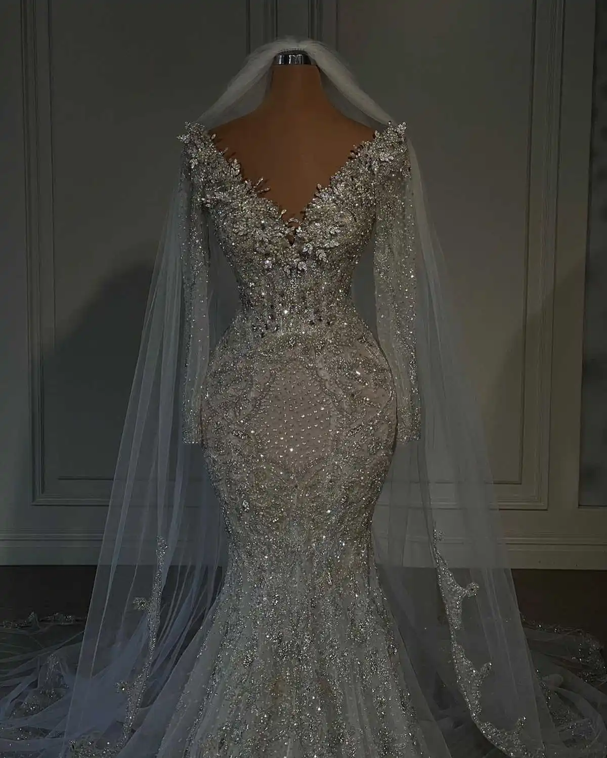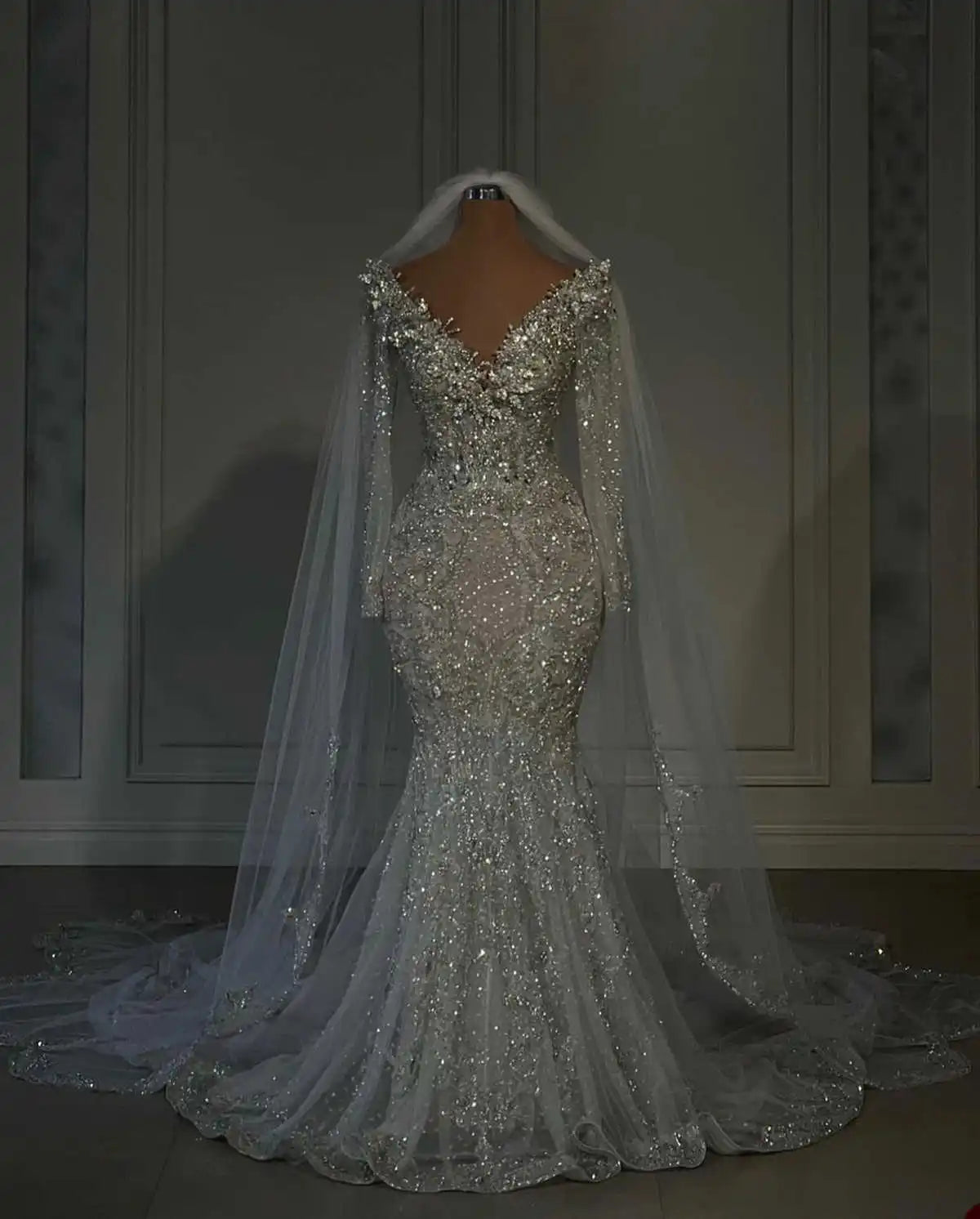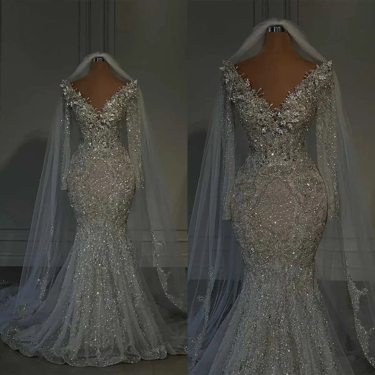 Glitter V Neck Wedding Dresses Crystal Bridal Gowns Sequins Beading Sweep Train Long Sleeve Customized Bride Dress