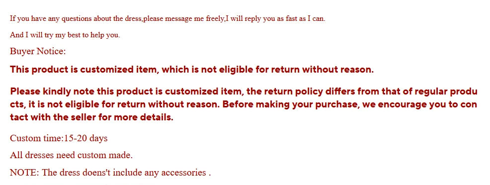 5.No ready - made any dress.All the dress need to custom-made! The whole custom made process(from the date we receive your payment and measurements) will take 8-15 working days(Urgent orders except).