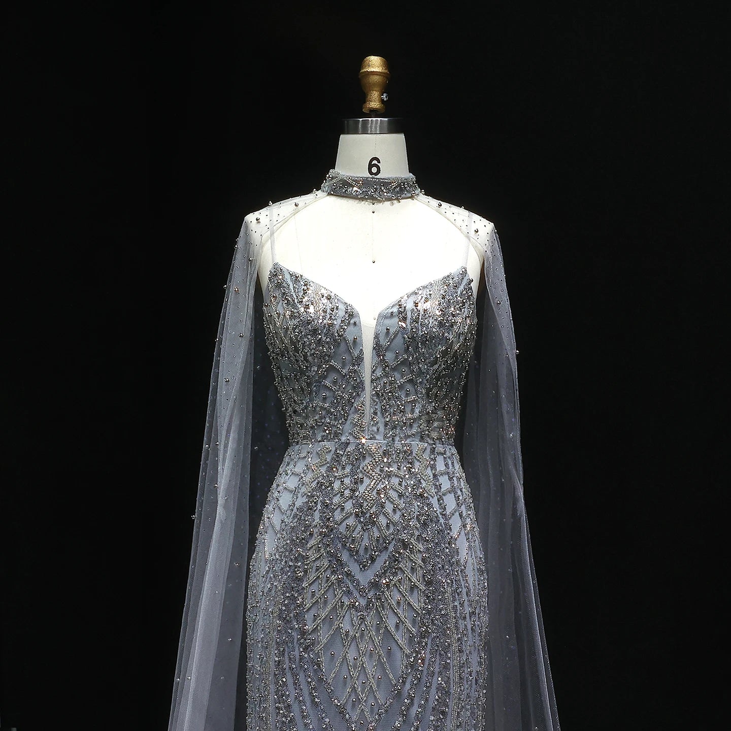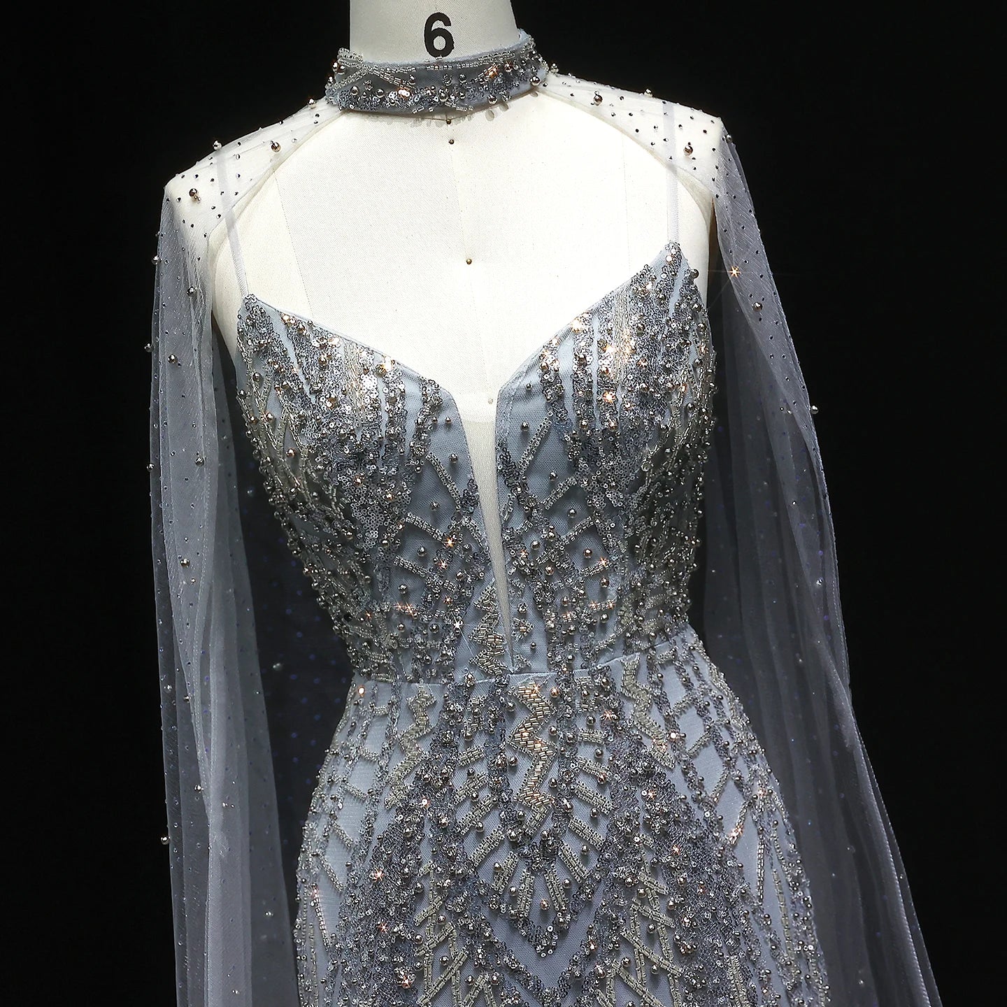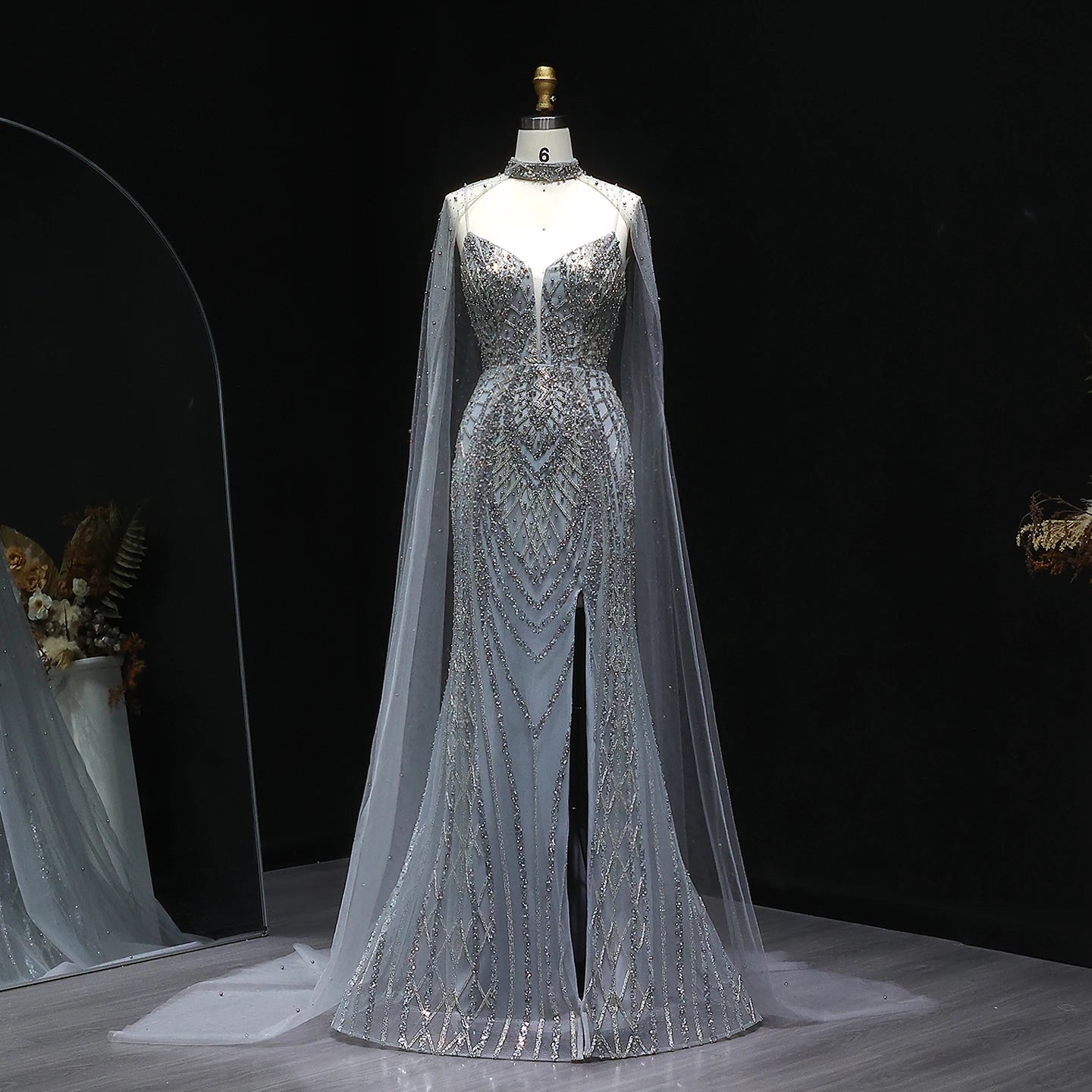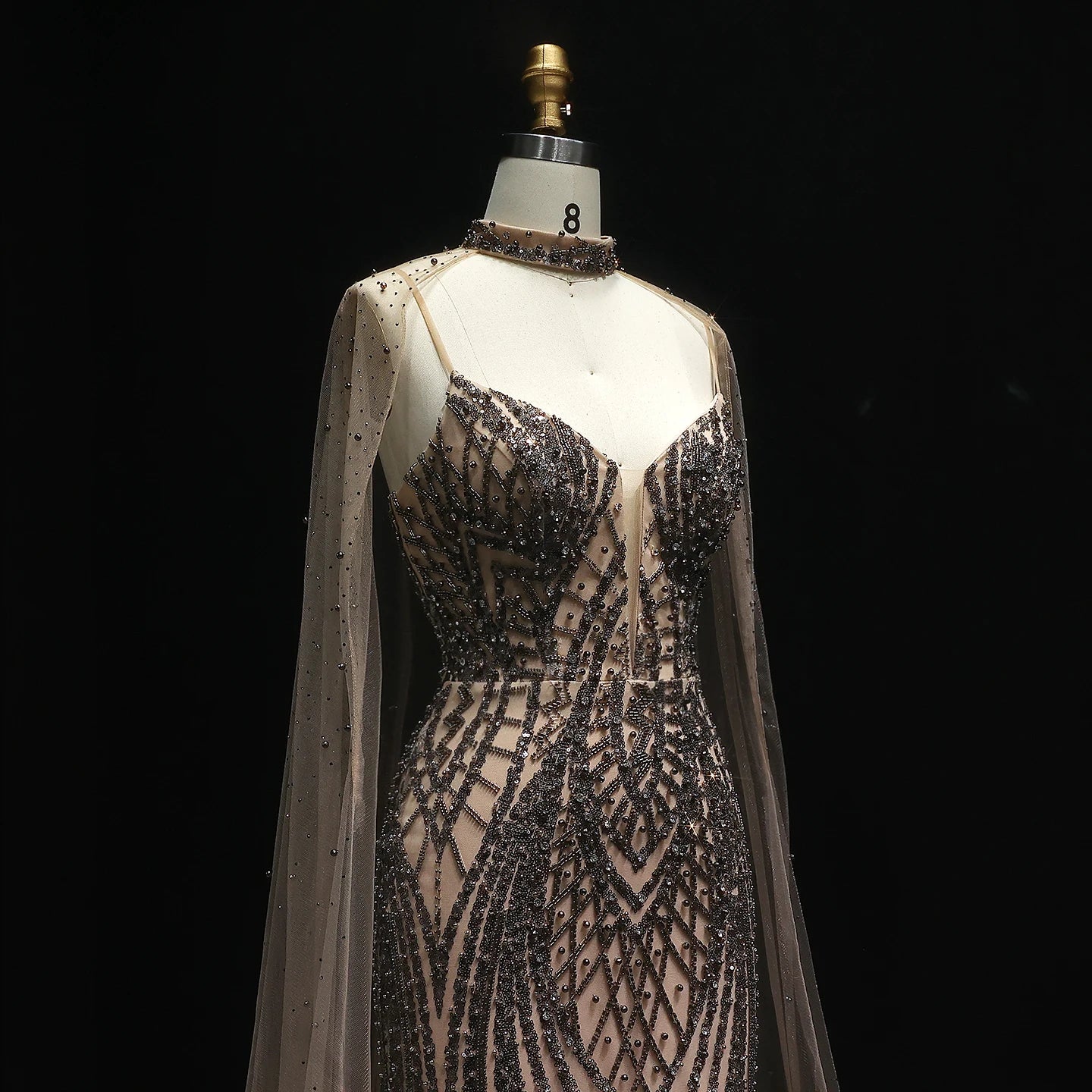Sharon Said Glamorous Beaded Brown Gray Memaid Evening Gown with Sheer Cape Side Slit Women Wedding Party Dress SS055 Customized